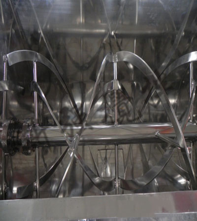 臥式螺條混合機由安裝于攪拌軸上的內外徑螺條帶動桶體內物料,使攪拌器在桶體內大范圍翻動物料。攪拌器結構上,螺條設計成內外、左右互為反螺條,攪拌器工作時內螺條帶動靠近軸心處物料做軸心旋轉,軸向由內至兩側推動,外螺條帶動靠近桶壁物料做軸心旋轉,軸向由兩側至內推動,于是造成物料在桶體內對流循環、剪切滲混,完成物料在較短時間內快速均勻混合。